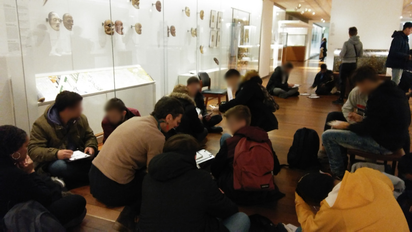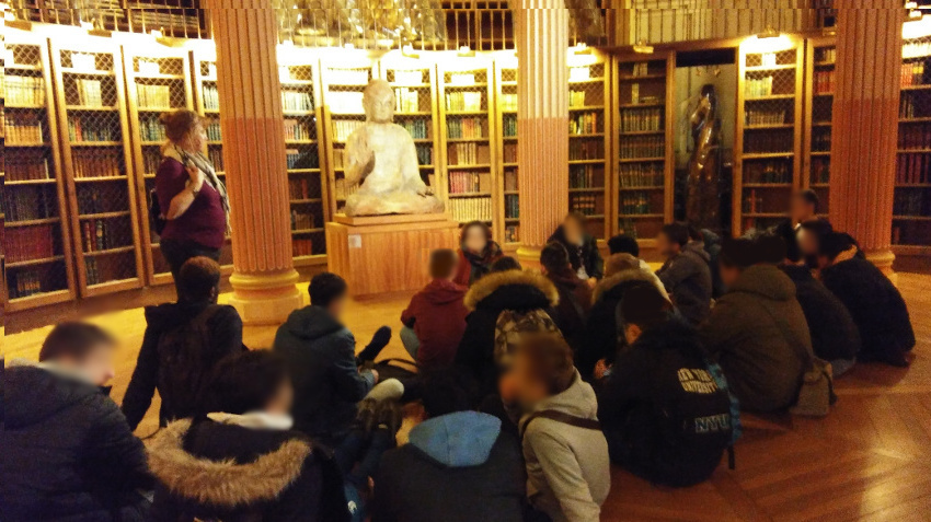 | Les élèves, accompagnés de leurs professeurs, Mme Cébarec, Mme Trousseau et Mme Even, professeur documentaliste, ont visité le musée Guimet, Musée national des arts asiatiques. Ils ont pu découvrir la section japonaise. Ils ont été émerveillés par la découverte de la culture japonaise. D’autant plus que ceux-ci ont pu participer à l’atelier manga animé par une artiste, ce qui a été bénéfique pour la réalisation d’une page de manga en art appliqué. Durant cet atelier, les élèves ont découvert les codes iconographiques du manga (expressions du visage des personnages, comment dessiner un personnage de face ou de profil). | Le Musée Guimet