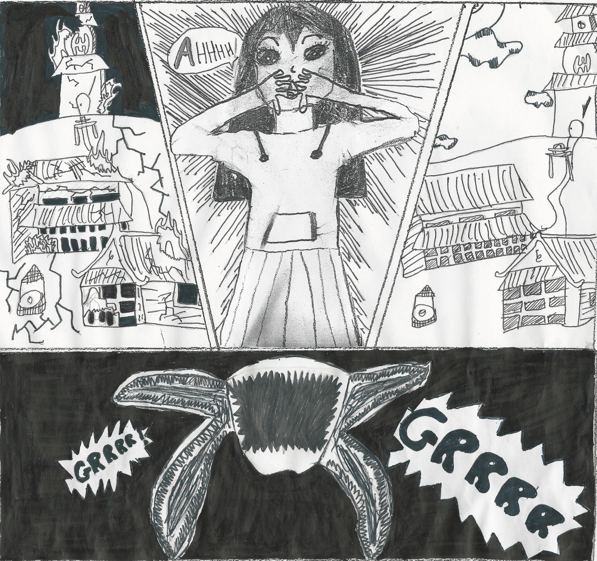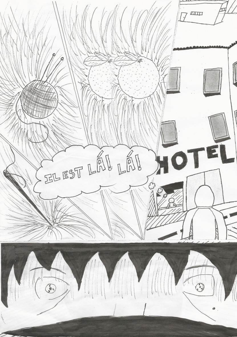Ils ont également travaillé avec leur professeur d’art appliqué, Mme Trousseau : ils ont découvert les techniques artistiques du manga puis ont travaillé sur la réalisation d’une page de manga : choix et signification des cadrages, forme et organisation des vignettes, graphisme de l’onomatopée, dessin de la bulle et son emplacement dans la vignette, travail des hachures et des aplats.